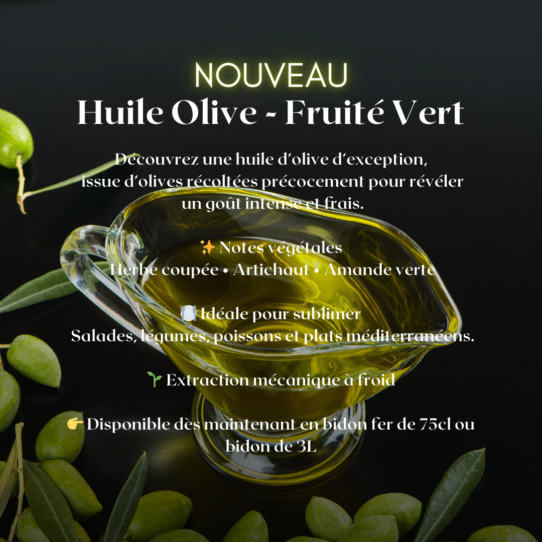Nous produisons notre huile d’olive vierge extra extraite à froid dans notre moulin à proximité de Nyons (Villedieu), à partir des olives de nos vergers de Nyons AOP. Nos bouteilles opaques conservent et respectent les arômes de notre huile. 2 contenants pour une même huile : packaging en fer blanc ou noir sérigraphié en 25 cl, 50 cl et 75 cl. Format bidon 3 ou 5 L pour recharger vos bidons.